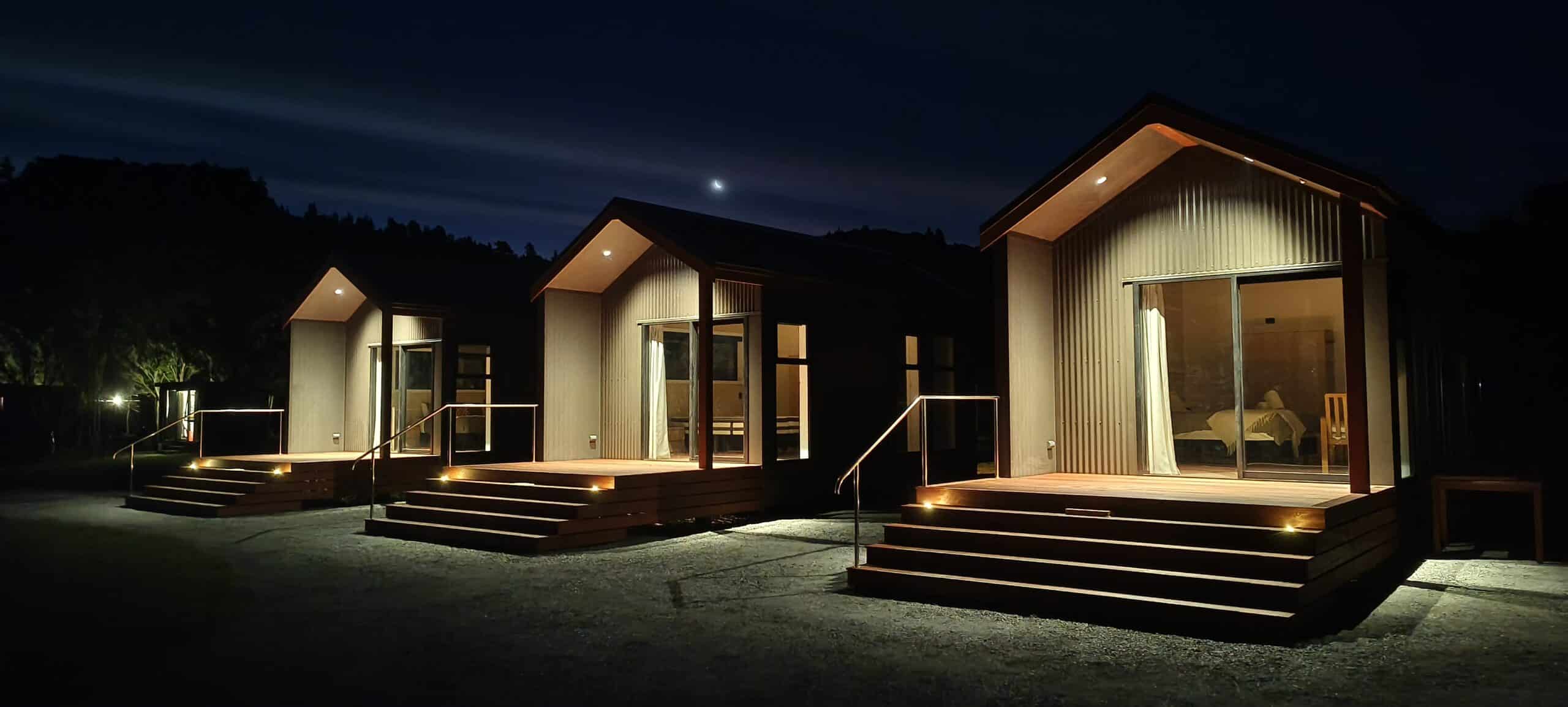 Each cabin includes a private ensuite with a spacious rain shower, modern fittings, and soft lighting, as well as a private timber deck for outdoor living. Everything has been designed to feel effortless, comfortable, and considered — a place where sustainability and comfort naturally go hand in hand.